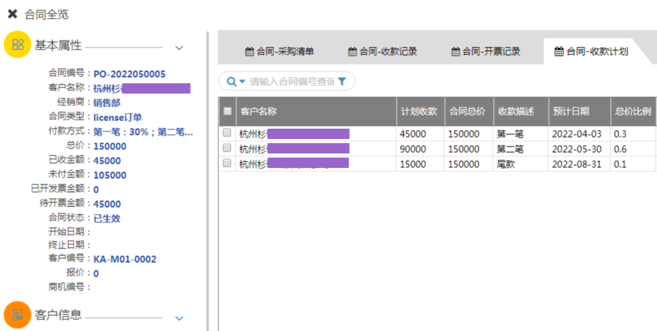 能對(duì)合同全局進(jìn)行查看(如 采購(gòu)清單、收款記錄、開票記錄、收款計(jì)劃等)